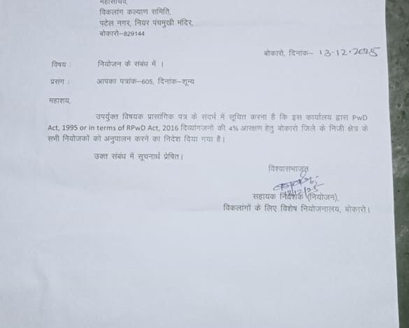 दिव्यांगजनों के नियोजन (रोजगार) से जुड़े मामलों में नियमों के उल्लंघन को लेकर विशेष नियोजनालय, बोकारो ने संज्ञान लिया है। इस संबंध में कार्यालय की ओर से जारी पत्र में स्पष्ट किया गया है कि दिव्यांग व्यक्तियों के लिए बनाए गए PwD Act, 1995 एवं RPwD Act, 2016 के प्रावधानों का सख्ती से अनुपालन किया जाए।