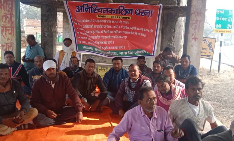 नावाडीह। प्रखंड के जुनोड़ीह गांव के ग्रामीण मंगलवार को अहराडीह के पूर्व मुखिया सुरेश कुमार महतो के नेतृत्व में अंचल कार्यालय परिसर में अनिश्चितकालीन धरने पर बैठ गए। ग्रामीणों का आरोप है कि बिना सत्यापन और बिना जांच उनके नाम जमीन से जुड़े फर्जी मामलों में नोटिस जारी किया गया है।